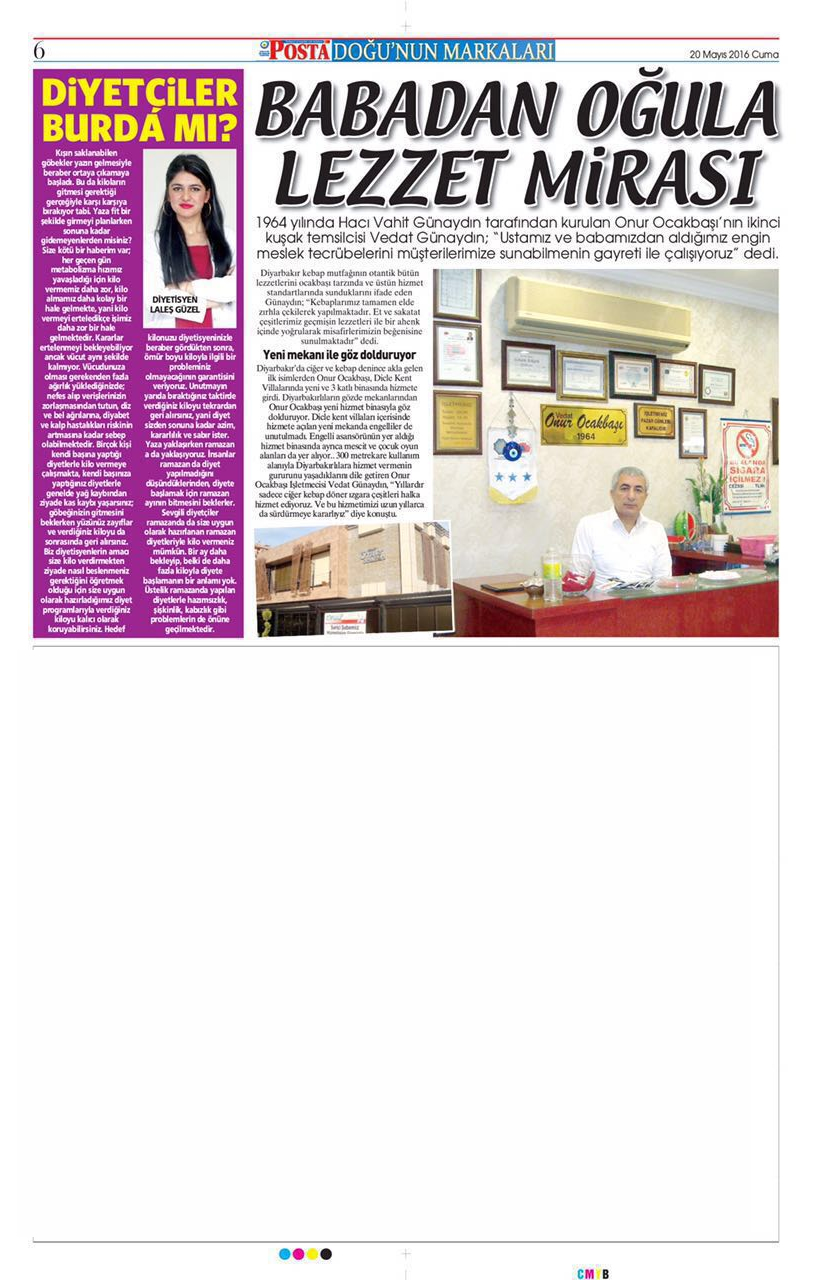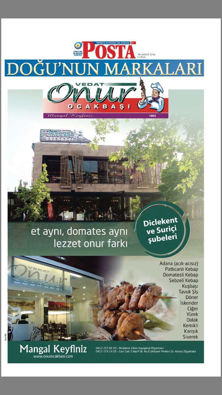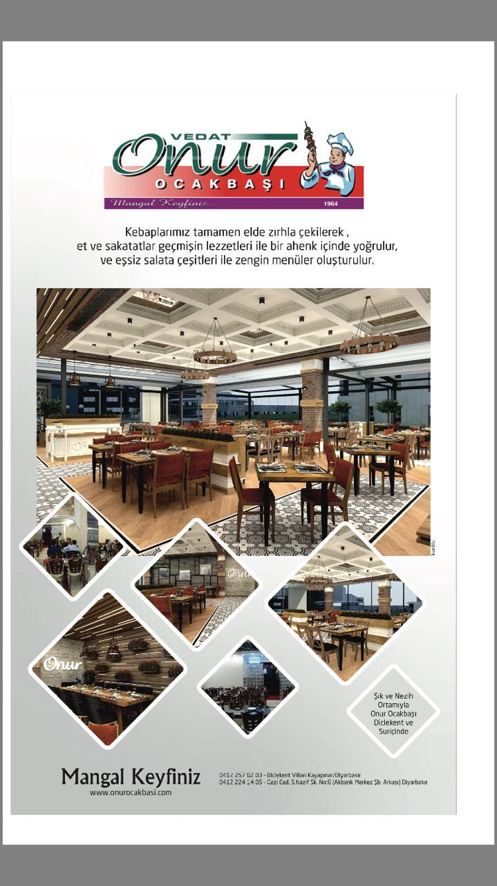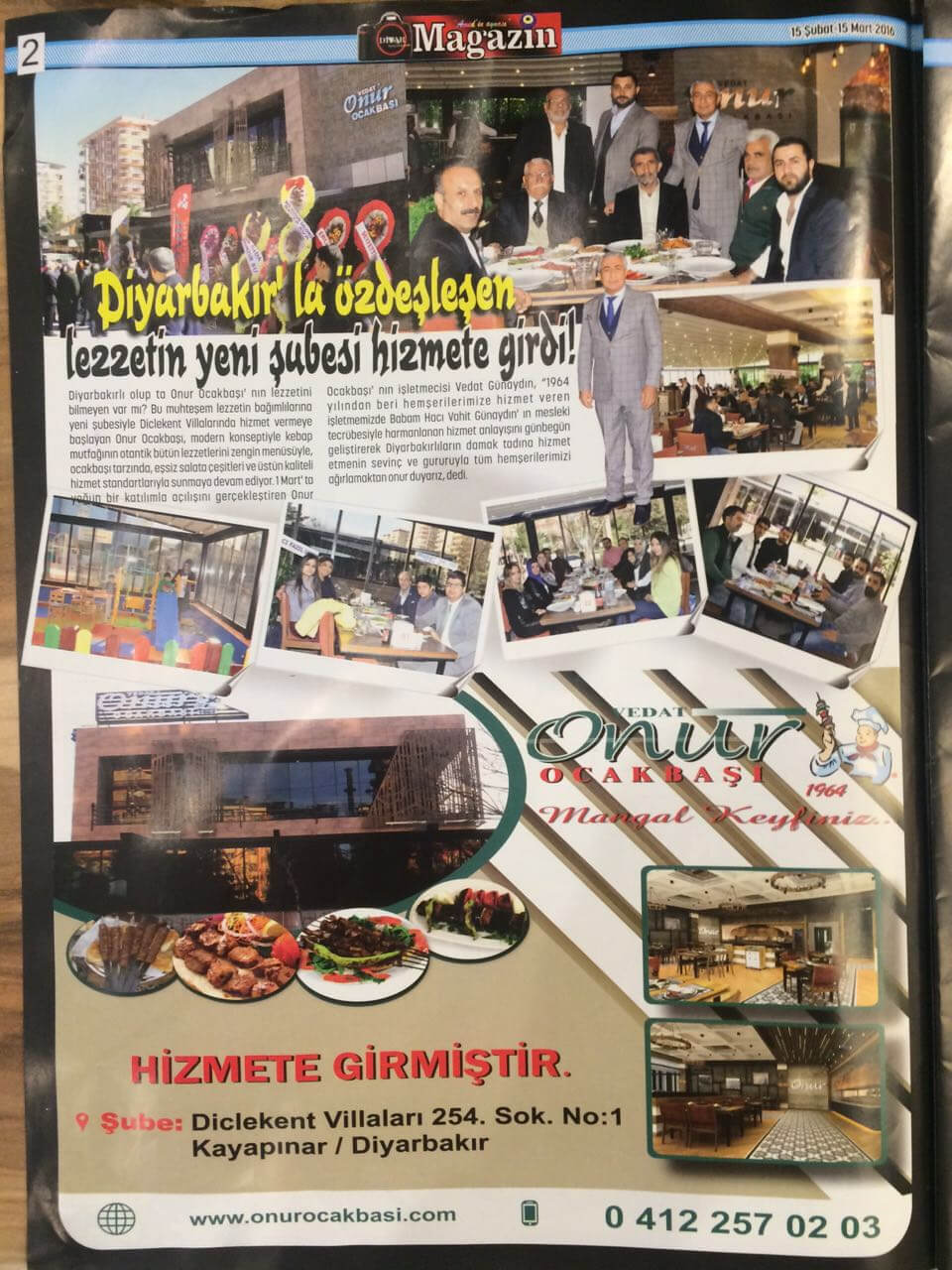 Sade bir açılış töreniyle Dualarla hizmete giren Onur Ocakbaşı açılışına çok sayıda çelenk ve çiçek geldi. Diyarbakır’da marka olan ve Diyarbakırlıların damak tadına hizmet eden Onur Ocakbaşı yeni hizmet binasıyla adeta göz dolduruyor. Dicle kent villaları Dicle kent mahallesi 254 sokak no1. Kayapınar ilçesinde hizmete açtıkları binalarında engellileri de unutmadılar. Engelli asansörünün yer aldığı hizmet binasında Mescit ve Çocuk Oyun Bahçesi’nin yanı sıra Aile Yeriyle de Diyarbakırlılara hizmet veriyor.
