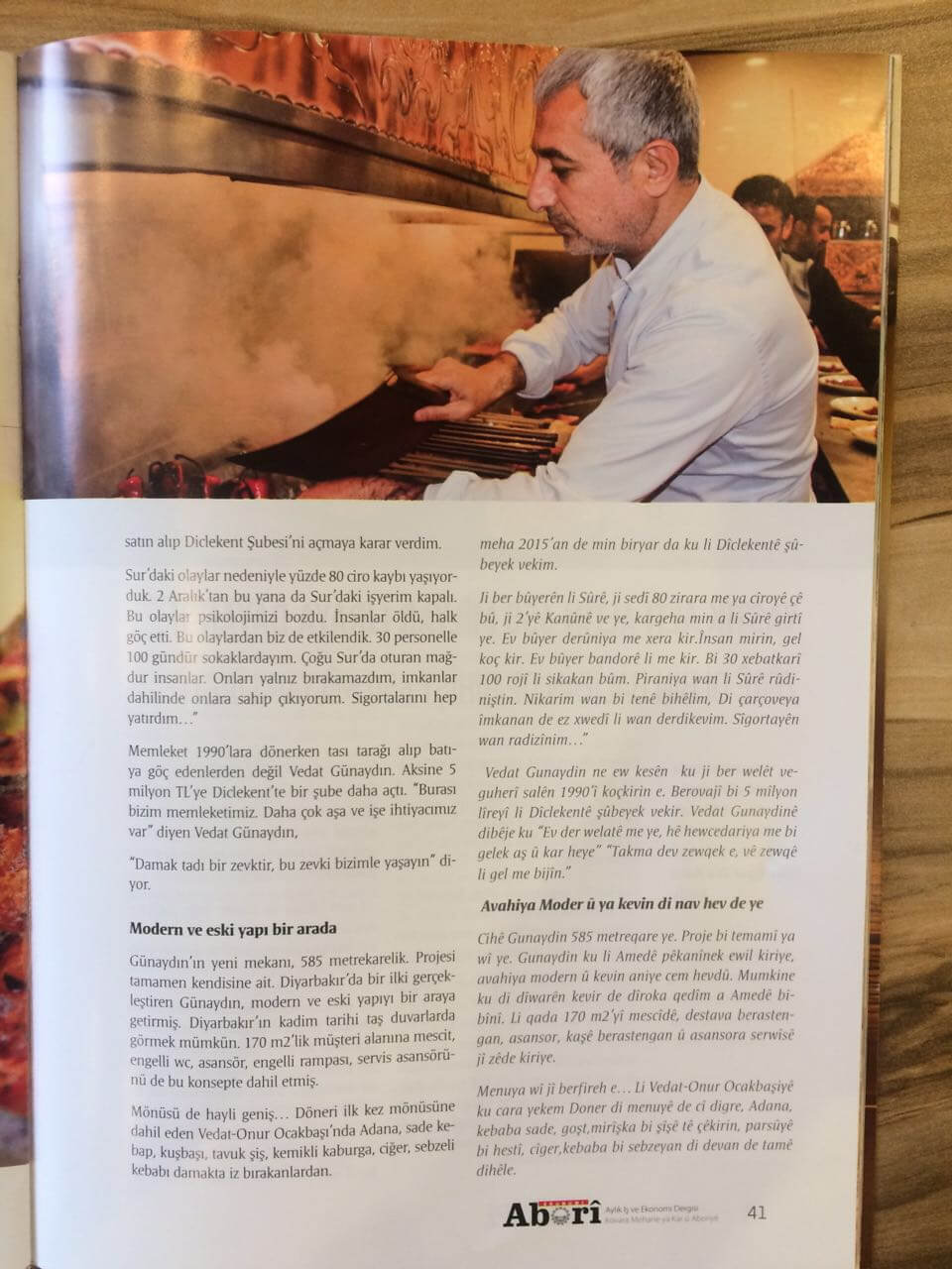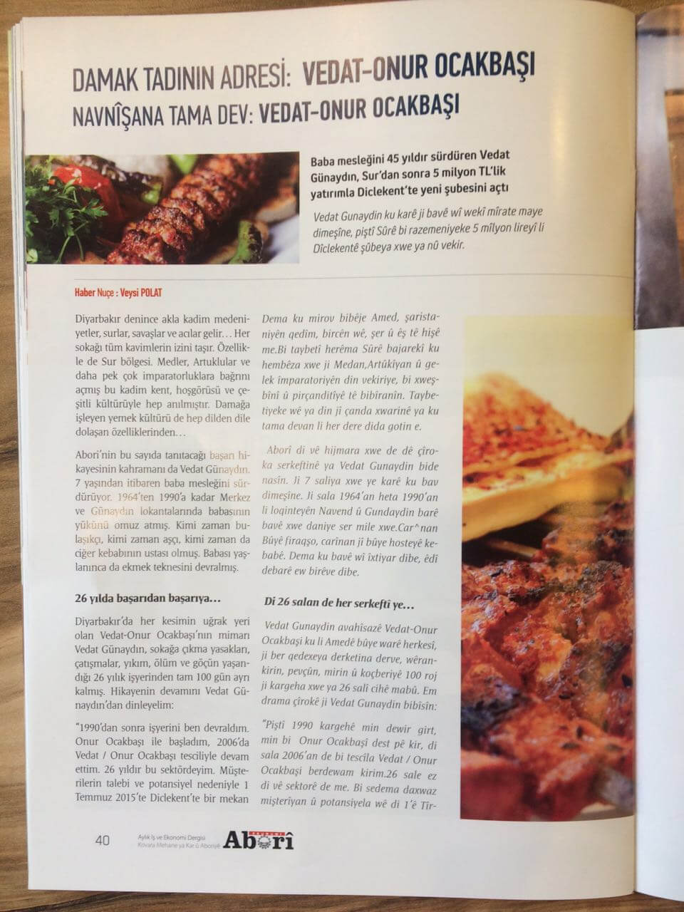 300 metre kullanım alanıyla Diyarbakırlılara hizmet vermenin gururunu yaşadıklarını dile getiren Onur Ocakbaşı İşletmecisi Vedat Günaydın, “Yıllardır sadece ciğer kebap döner ızgara çeşitleri halka hizmet ediyoruz. Ve bu hizmetimizi uzun yıllarca da sürdürmeye kararlıyız” diye konuştu.